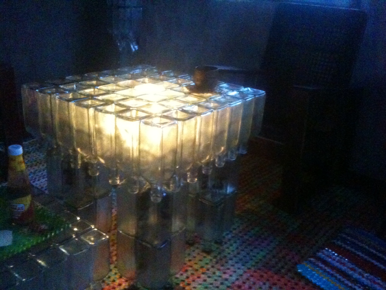 A Table of Light: the latest Trashure creation using nothing but gin bottles, this prototyp Chinese table is illuminated from within with a 10 watt bulb secured within a central bottle that has been cut in half.